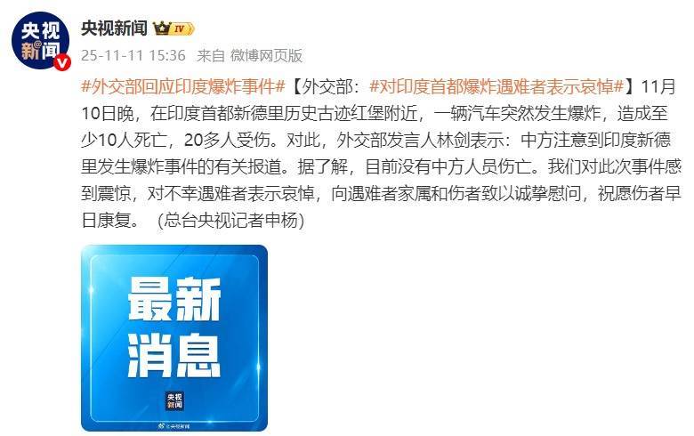 对此,社交部发言东说念主林剑暗示:中方详实到印度新德里发生爆炸事件的关联报说念。据了解,现在莫得中方东说念主员伤一火。咱们对这次事件感到畏俱,对灾荒遭难者暗示吊唁,向遭难者家属和伤者致以忠实慰问,祝贺伤者早日康复。