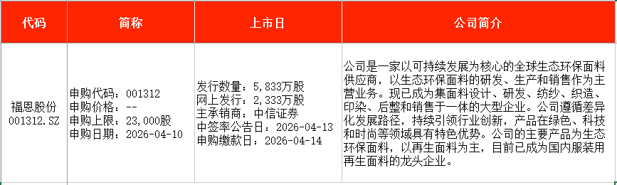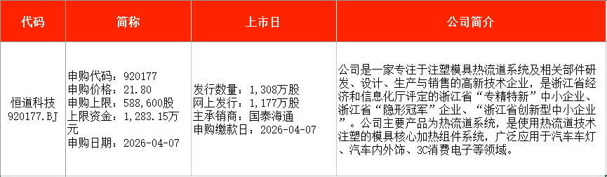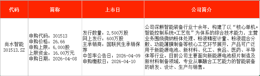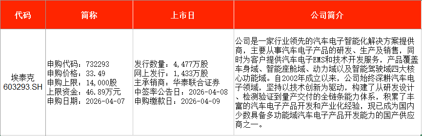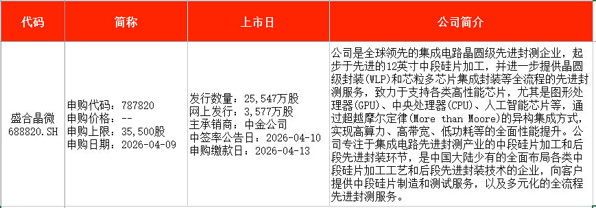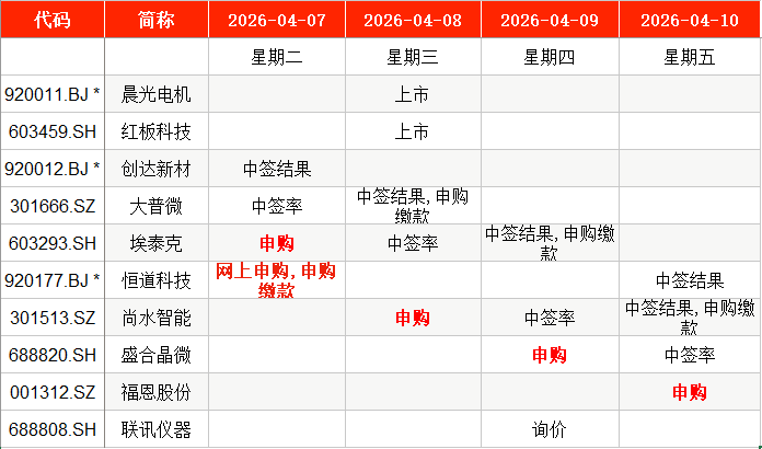 从时期表看,埃泰克(603293)、恒谈科技(920177)在本周二(4月7日)申购,尚水智能(301513)将在本周三(4月8日)申购,盛合晶微(688820)将在本周四(4月9日)申购,福恩股份(001312)则在本周五(4月10日)申购。