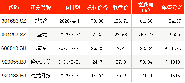 3月31日,慧谷新材(301683)在创业板挂牌上市,刊行价为78.38元/股,限度上市首日收盘,该股报126.71元/股,涨幅为61.66%。以收盘价狡计,投资者中一签浮盈为2.42万元。