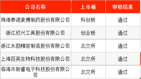 其中,拟在科创板上市的珠海泰诺麦博制药股份有限公司(下称“泰诺麦博”),拟在创业板上市的浙江欣兴器用股份有限公司(下称“欣兴器用”),以及拟在北交所上市的浙江永励精密制造股份有限公司(下称“永励精密”)、上海百英生物科技股份有限公司(下称“百英生物”)、临海市新睿电子科技股份有限公司(下称“新睿电子”)等均得手过会。