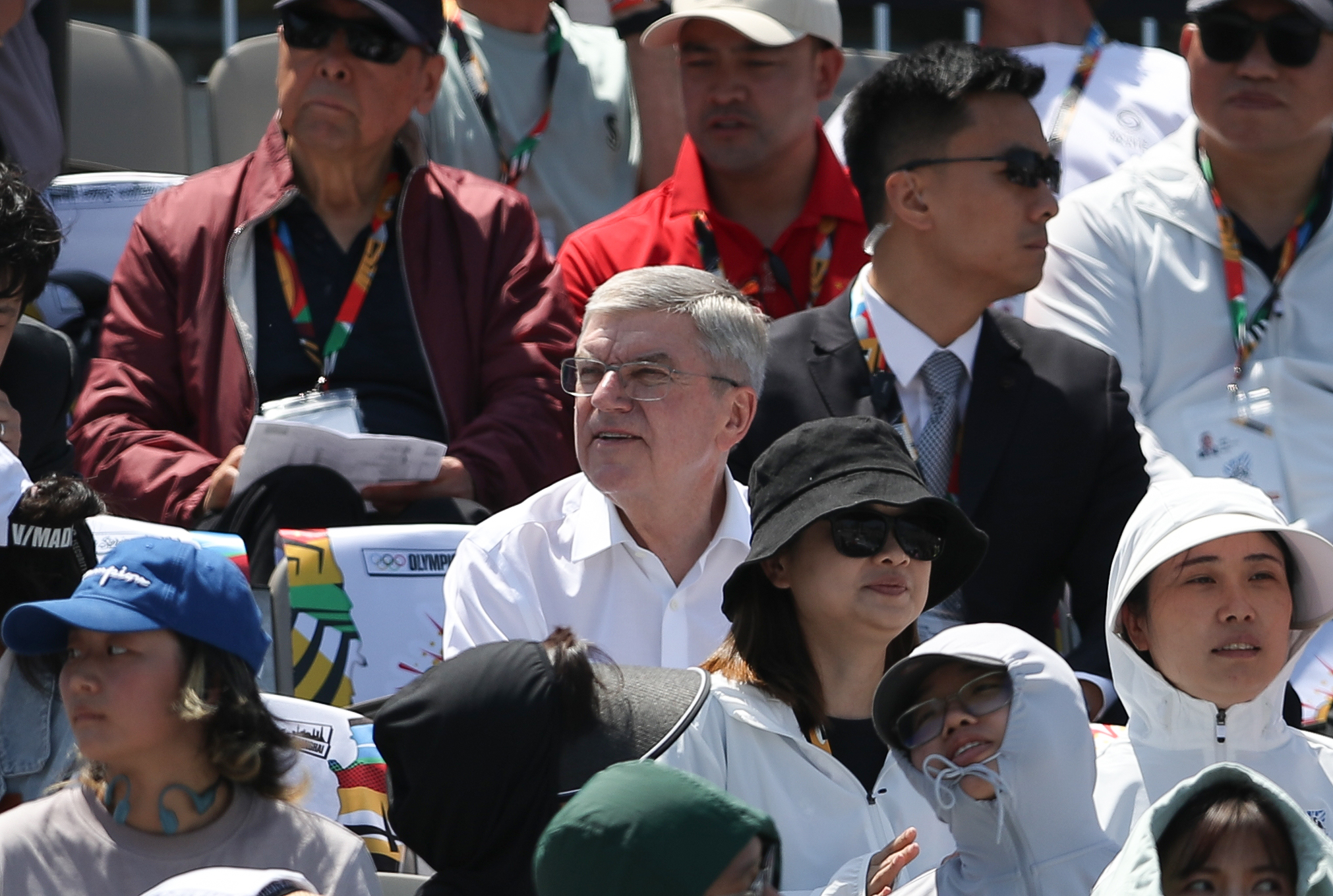 5月18日,海外奥委会主席巴赫(中)在看台上不雅看比赛。新华社记者 许雅楠 摄