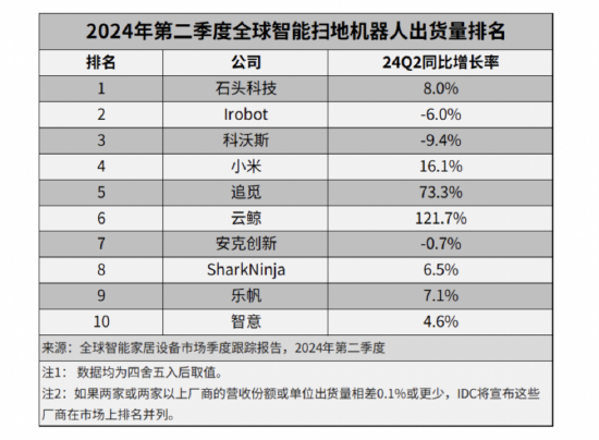 据IDC最新论说,2024年二季度,各人智能扫地机器东谈主出货511.7万台,同比增长15.7%。在出货量前十位的企业中,中国公司或中资控股公司占了9家。其中,石头科技的扫地机器东谈主出货量和金额均为各人第一;好意思国公司Irobot出货量同比下滑6%,排行第二;科沃斯的出货量也有下滑,同比减少9.4%至第三位。第四至第十名的公司轮番是小米、追觅、云鲸、安克改变、SharkNinja、乐帆和智意。
