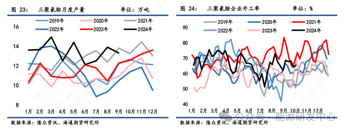 三聚氰胺和脲醛树脂的下流需求均与房地产高度磋商,因此房地产的疲弱使得三聚氰胺和脲醛树脂的需求难以出现大幅增长,但本年以来三聚氰胺出口量保捏高位,带动三聚氰胺产量增多昭着。数据清醒,2024年1-9月世界三聚氰胺累计产量为120.96万吨,累计同比增多22.11万吨,增长22.36%;1-8月份世界三聚氰胺累计出口量为40.24万吨,占总产量的37.38%。尽管三聚氰胺的国内需求量一般,但因出口利润较好,三聚氰胺出口大幅增多,对三聚氰胺产量有较强的复古,从现在的情况来看,三聚氰胺日产量仍保捏中高位,在出口利好的复古下,洽商后期三聚氰胺开工保捏巩固。本年工业需求的增量孝敬主要在于电厂脱硫脱硝,尿素替代液氨的修订升级仍在安祥进行中,战略要求 2024 年底之前电力行业液氨关键危急源一谈完成修订,因此洽商后期电厂脱硫脱硝对尿素需求稳步擢升,但跟着年底的附近,名目络续完成,需求增量有缓缓转弱的预期。