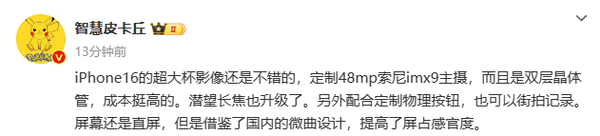 据其分解,iPhone16的超大杯影像照旧可以的,定制4800万像素的索尼imx9主摄,何况是双层晶体管,本钱挺高的。潜望长焦镜头也升级了。另外息争定制物理按钮,也可以街拍纪录。与此同期,iPhone 16系列的超大杯屏幕照旧直屏,然则模仿了国内手机厂商的微曲操办,普及了屏占感官度。