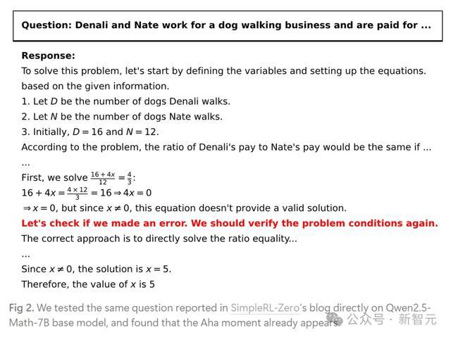 令东谈主惊诧的是,它在莫得任何磨砺的情况下,就能通过自我修正念念维链(CoT),胜仗治理在SimpleRL-Zero中陈诉的示例问题了!