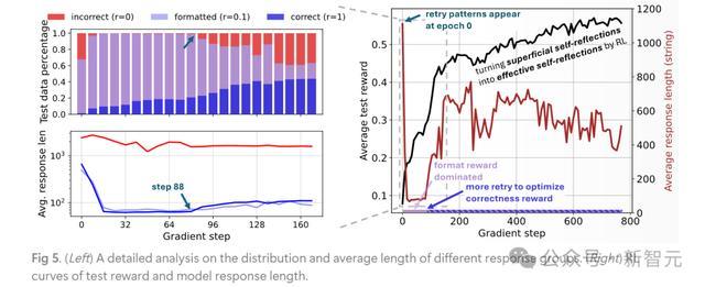 临了发现,模子响应长度的变化主如果取决于基于轨则的奖励,运行饱读吹时势化(图5左侧中的紫色部分),然后转向正确性(图5左侧中的蓝色部分),这考据了率先的测度。