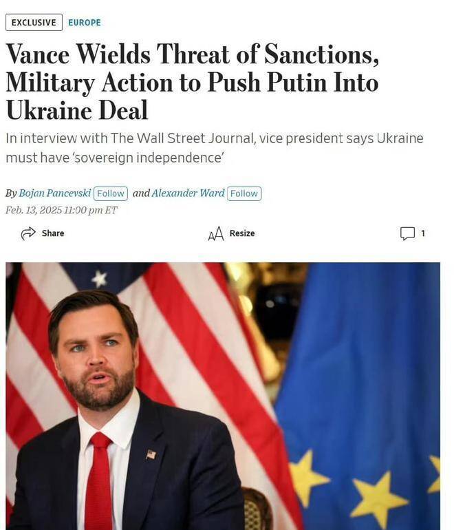 好意思国副总统J.D.万斯:淌若普京拒却公说念的媾和条约,不遗弃向乌克兰打发好意思军,并提议与莫斯科“重启关连”——WSJ**