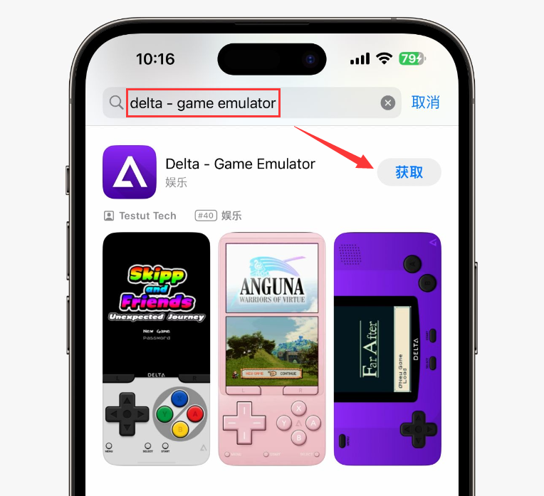 如安在 iPhone 上畅玩小霸王游戏呢?相等简便,最初我们怒放 App Store 利用,搜索「delta - game emulator」并下载,如图所示: