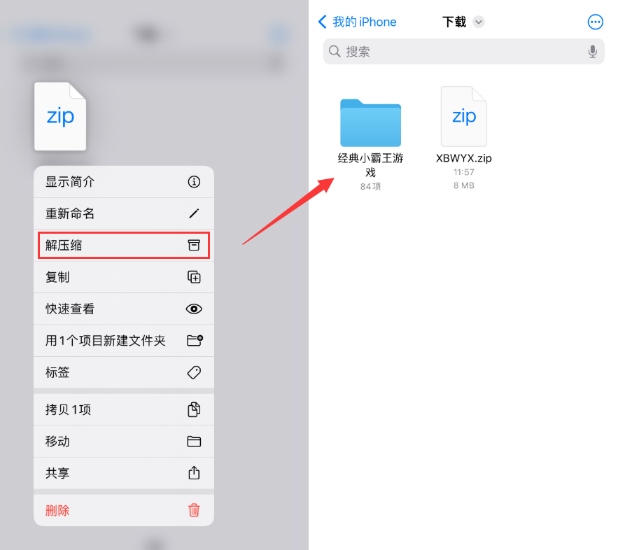 由于下载的是压缩文献,我们需要怒放文献,找到刚刚下载的游戏书册,长按并解压。